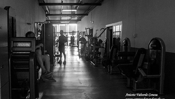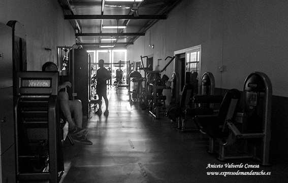 En el fondo de esta sala, se ve una cristalera iluminada por el sol de la mañana y las figuras recortadas a contraluz de los deportistas. Cada uno se lo toma a su modo combinando pesos y número de veces que hace el ejercicio (repeticiones) según sea su objetivo.